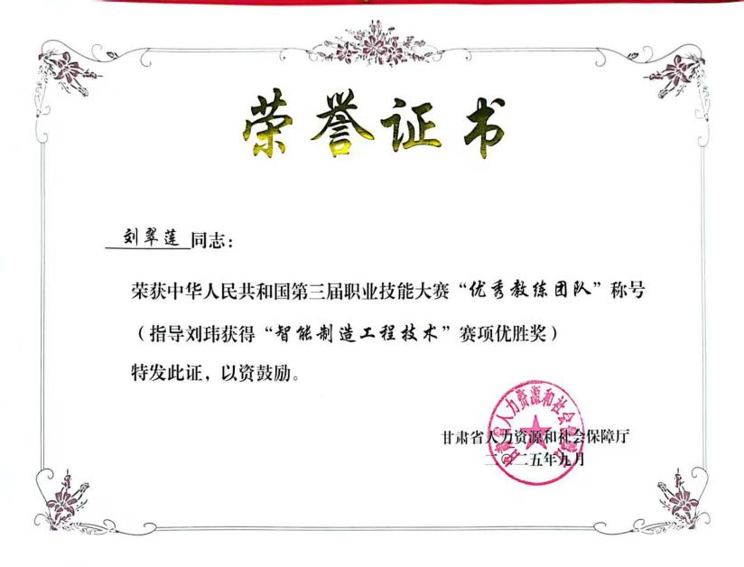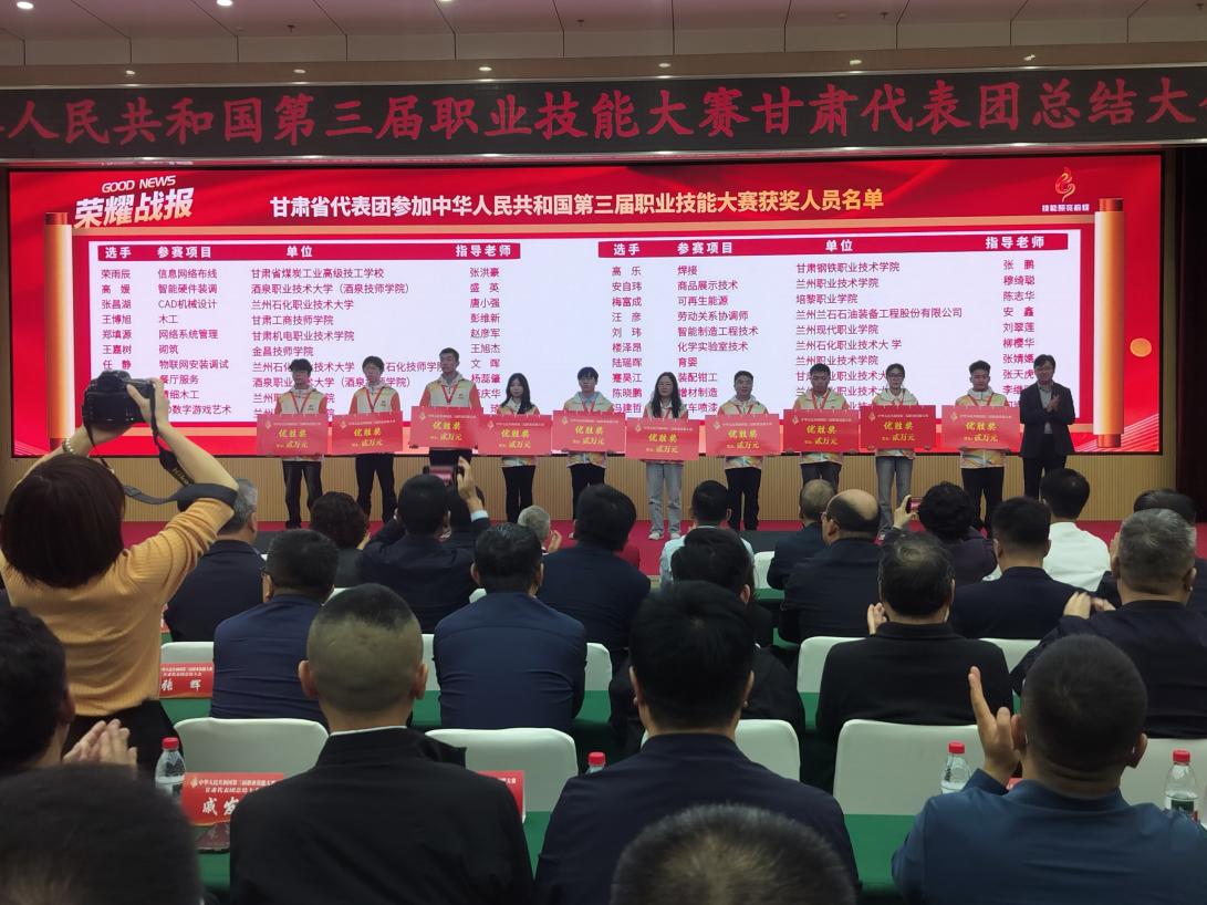 大会通报甘肃代表团获奖情况,颁发相关奖金、奖牌及证书。其中,我院刘玮老师代表甘肃参加“智能制造工程技术”赛项,获“优胜奖”,实现甘肃在该项目奖牌零突破;刘翠莲老师获“优秀教练团队”称号。