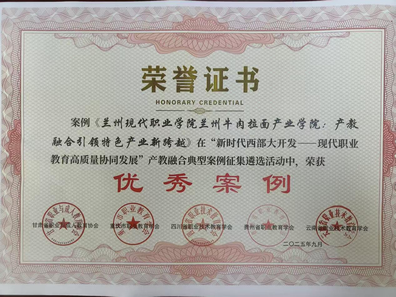 近日,在“新时代西部大开发——现代职业教育高质量协同发展”产教融合典型案例评选中,我院三项产教融合案例——《兰州现代职业学院兰州牛肉拉面产业学院:产教融合引领特色产业新跨越》《兰州现代职业学院京东产业学院双创育人典型案例》以及《筑巢引凤 共建共享 人才共育 校企共赢——校企合作促进中职专业汽修专业建设典型案例》,获“优秀案例”奖,并被收录于《甘肃省职业与成人教育协会产教融合典型案例汇编》。同时,我院杨震荣、耿宁聆、张文川三名同学荣获“技术技能之星”称号,展现出学院在技能人才培养方面的扎实成效。