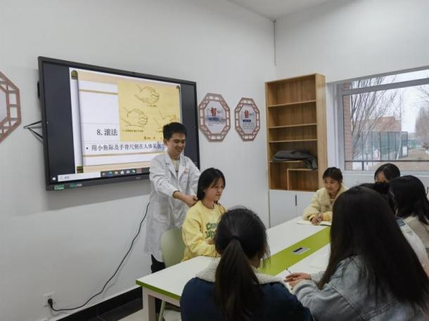 卫生健康学院组织专任课教师走进“一站式”学生社组织开展“守护健康,传承国粹”主题活动,通过理论讲解、实操演示、互动体验等形式,让学生们了解中医推拿的基础知识和简单技法,以“小手拉大手”的方式,带动学生共同关注中医药文化,为健康中国建设培育新生力量。